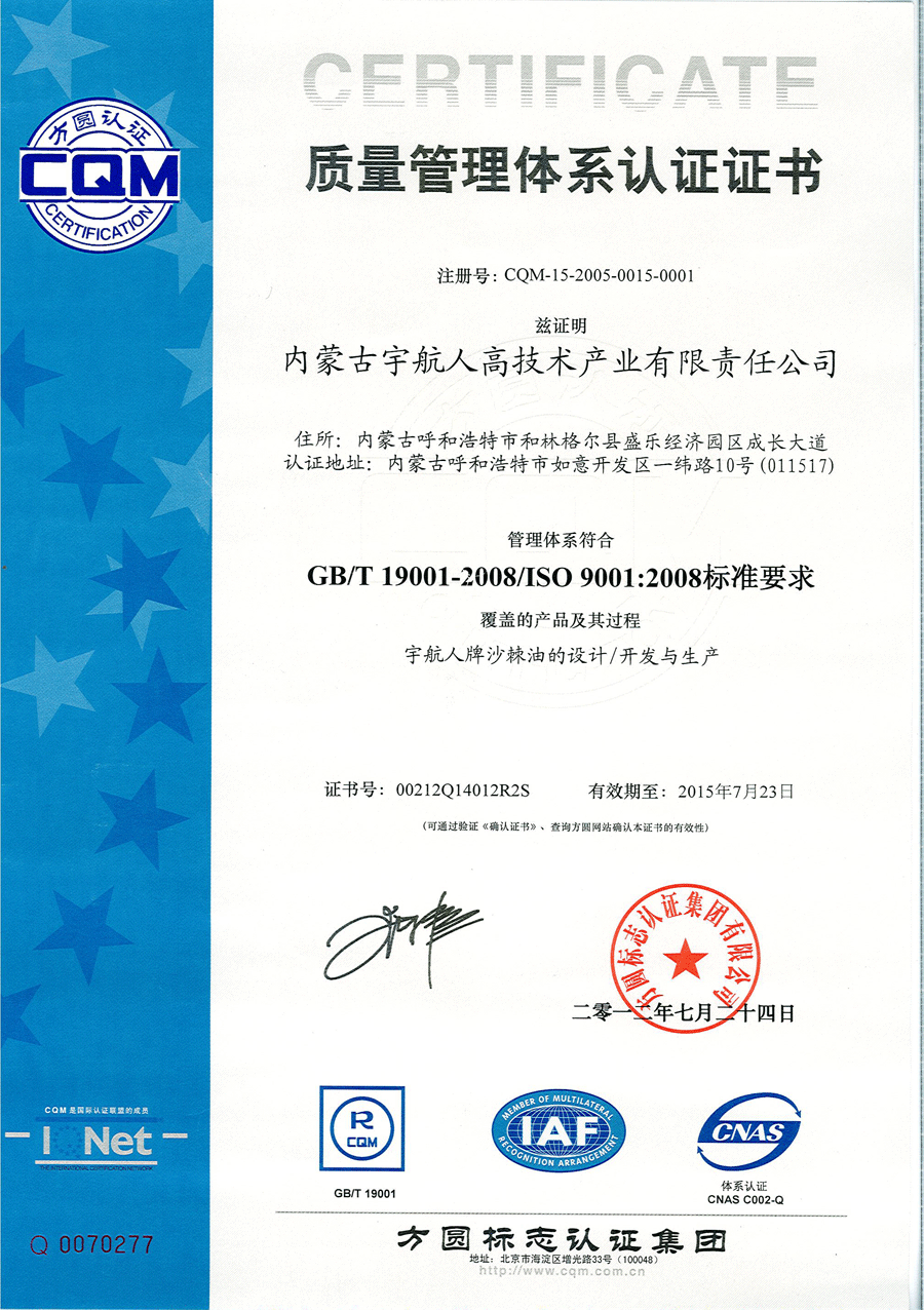 宇航人沙棘籽油是來自中國內蒙古大草原純天然的綠色食品,獲得中國 AA級綠色食品、中國保健食品、中國有機食品、 歐盟有機食品認證的“四方”認證産品,産品品質達到了頂尖水平。