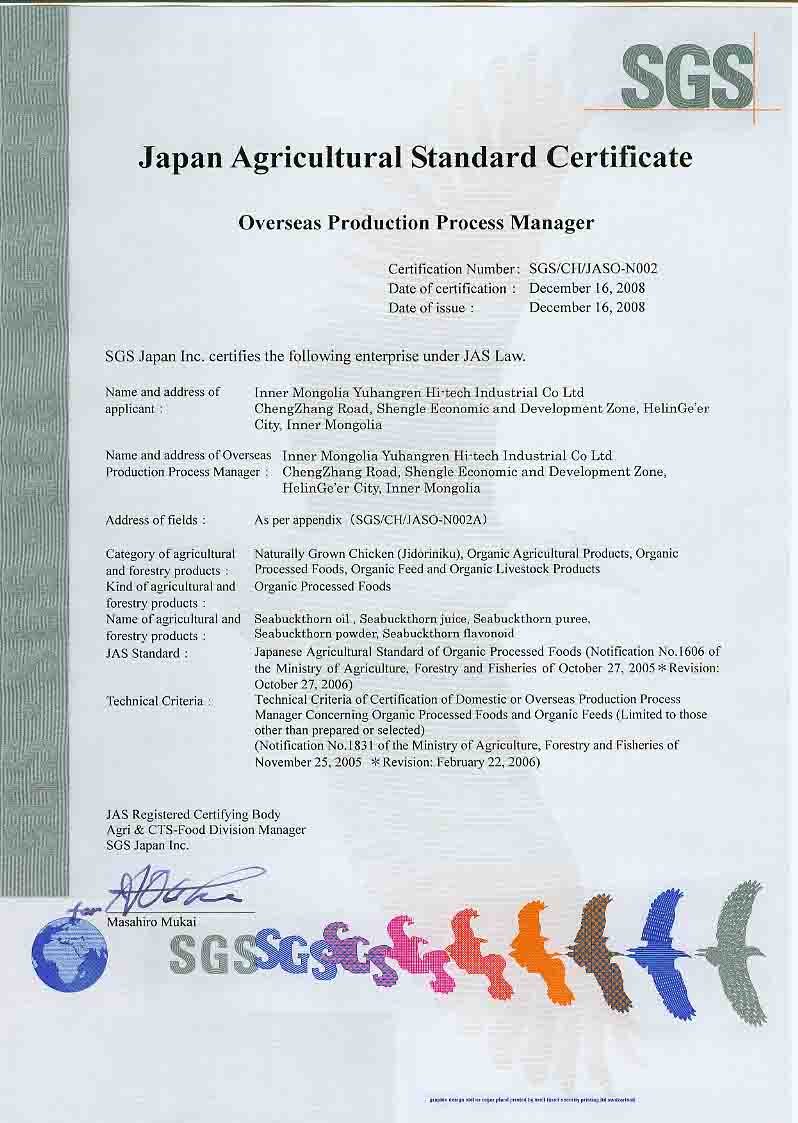 當今世界食品安全最高、最嚴格的標準之一。日本對農產品的要求非常嚴格。JAS標準要求的控制環節均高於其他質量標準。對原料基地有嚴格的要求: